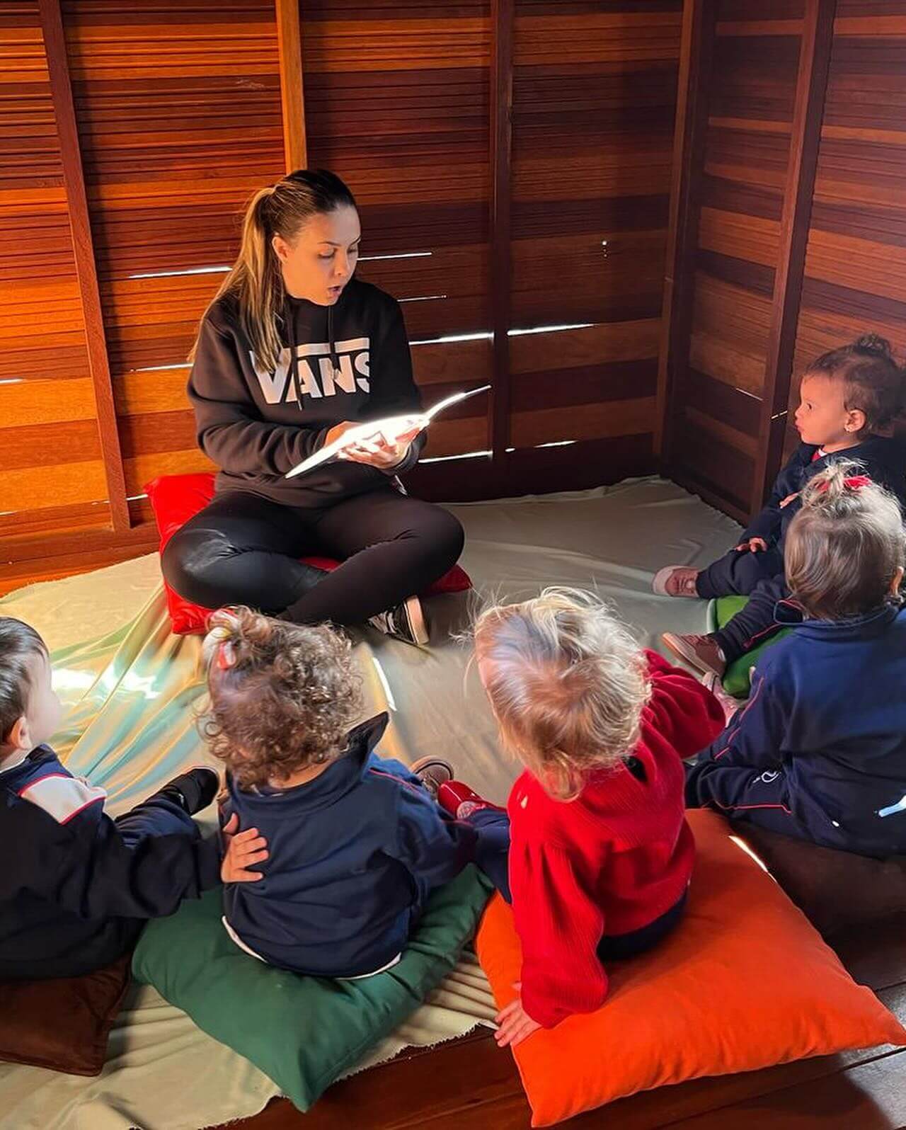 Além de estimular o hábito da leitura, essa vivência amplia o repertório de palavras e incentiva as crianças a nomearem partes do corpo, fortalecendo o autoconhecimento e a autonomia.