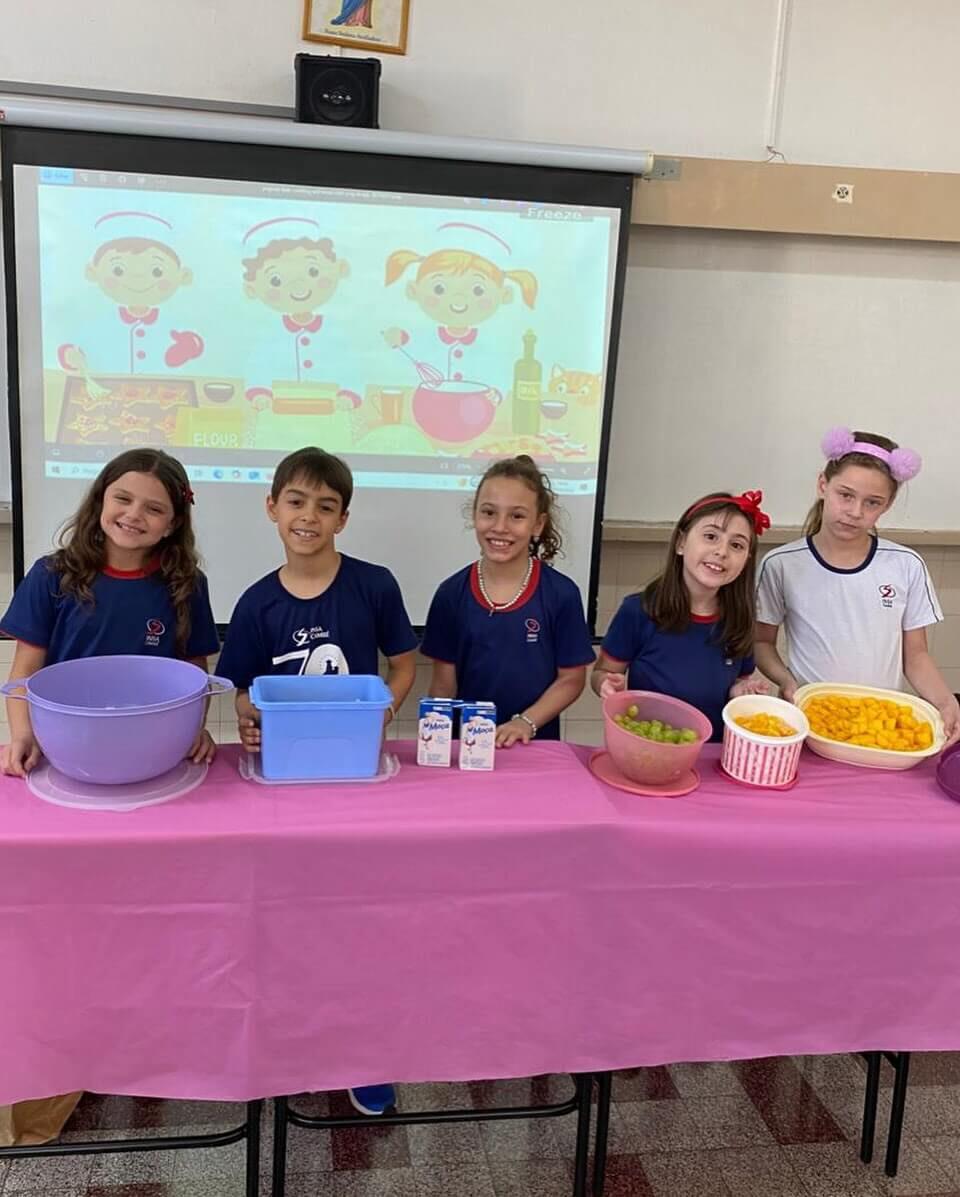 Os alunos do 3º ano M.A. e do 3º ano L.V. finalizaram, de forma especial, o Projeto 1 do livro Ampliando Rotas. A proposta, que teve como tema central “Cultura à Mesa”, proporcionou aos estudantes uma vivência prática sobre a importância da alimentação saudável no dia a dia.