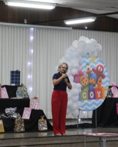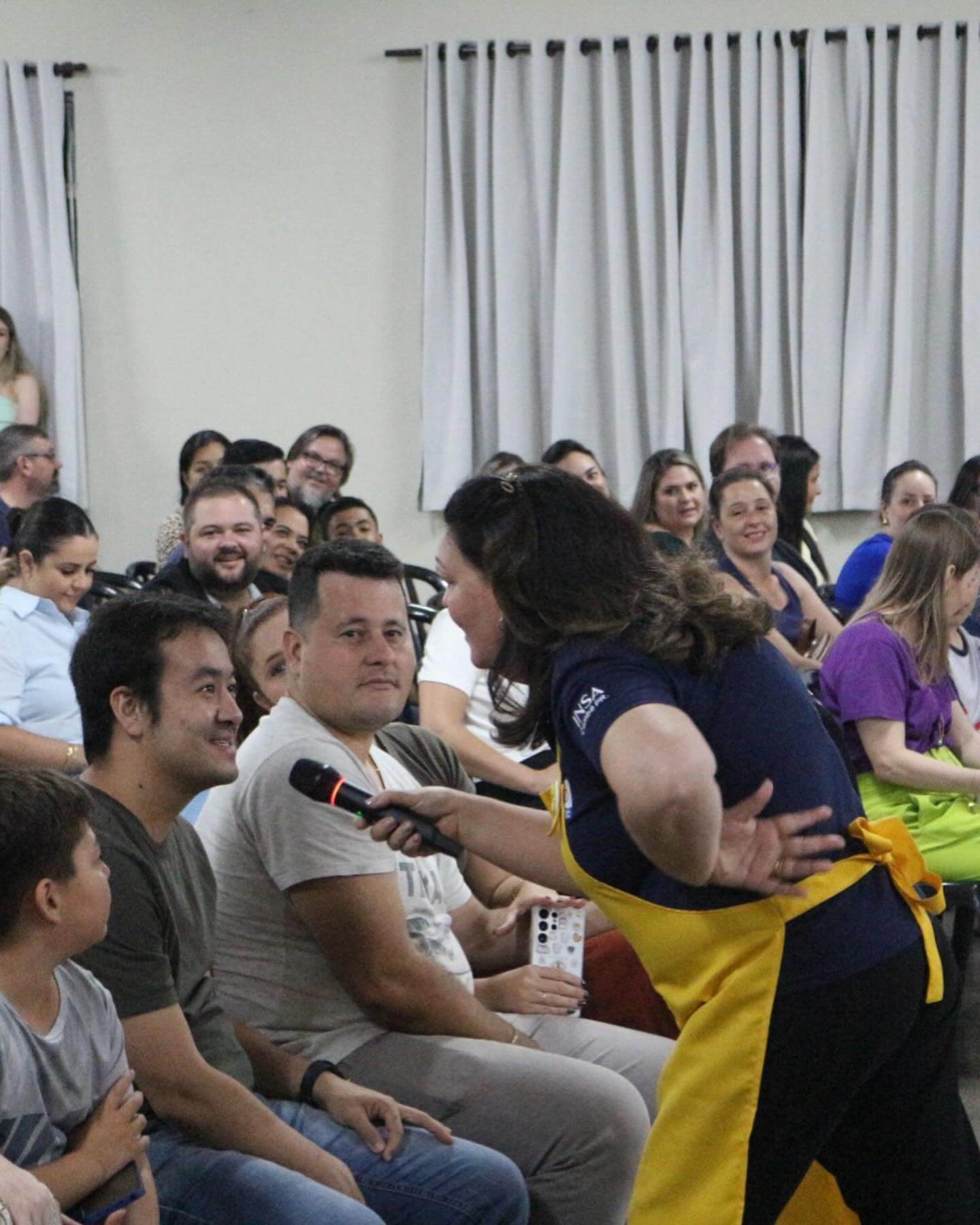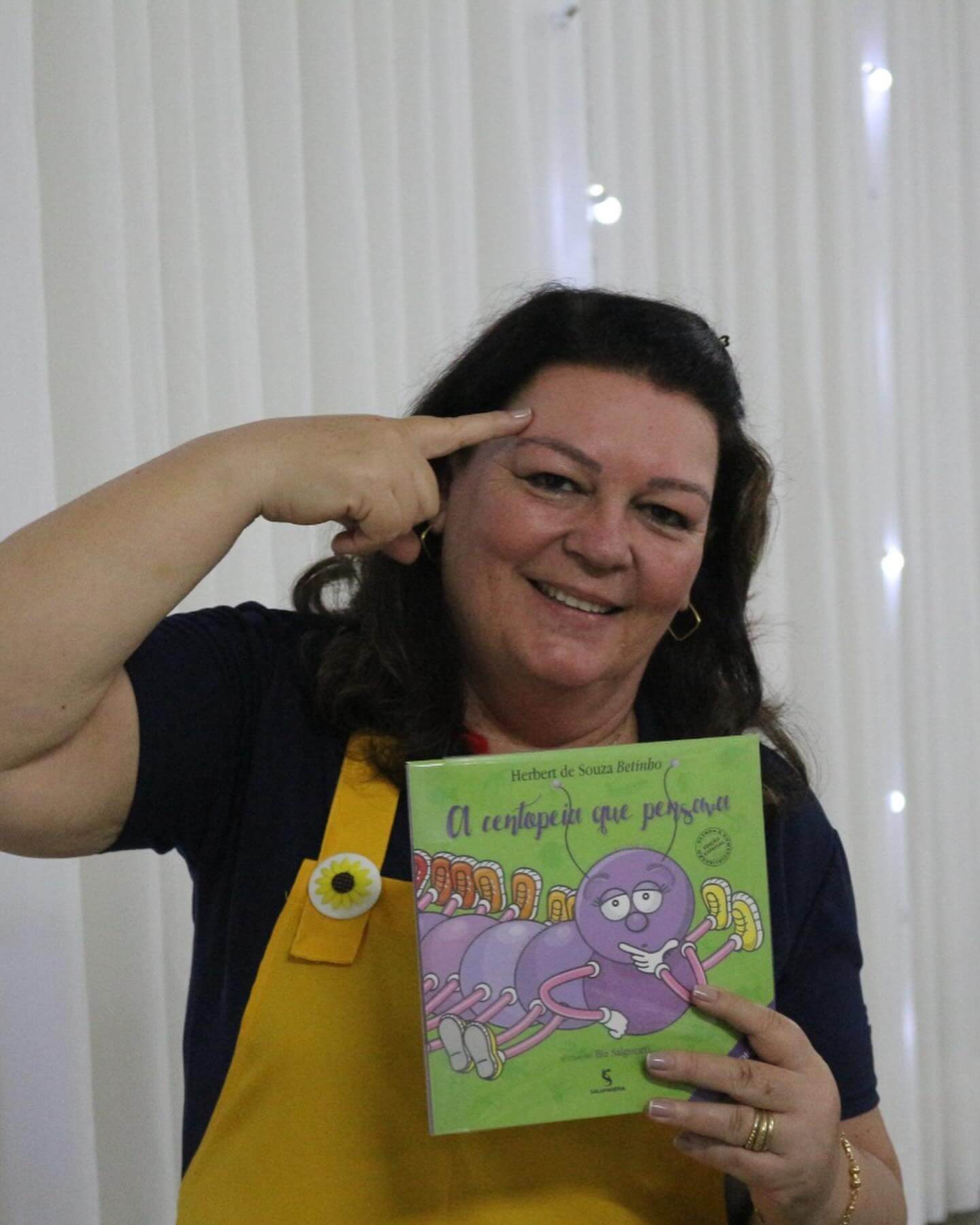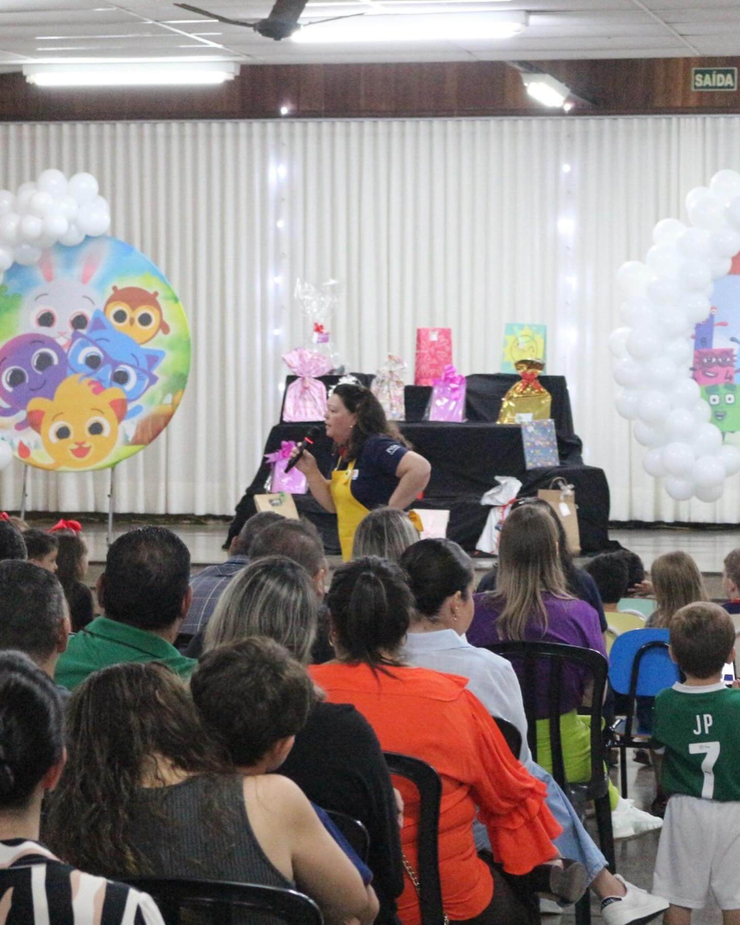 Um dos destaques da celebração foi o momento de contação de histórias conduzido pela “tia Márcia”, bibliotecária da escola, que encantou as crianças e tornou a experiência ainda mais significativa.