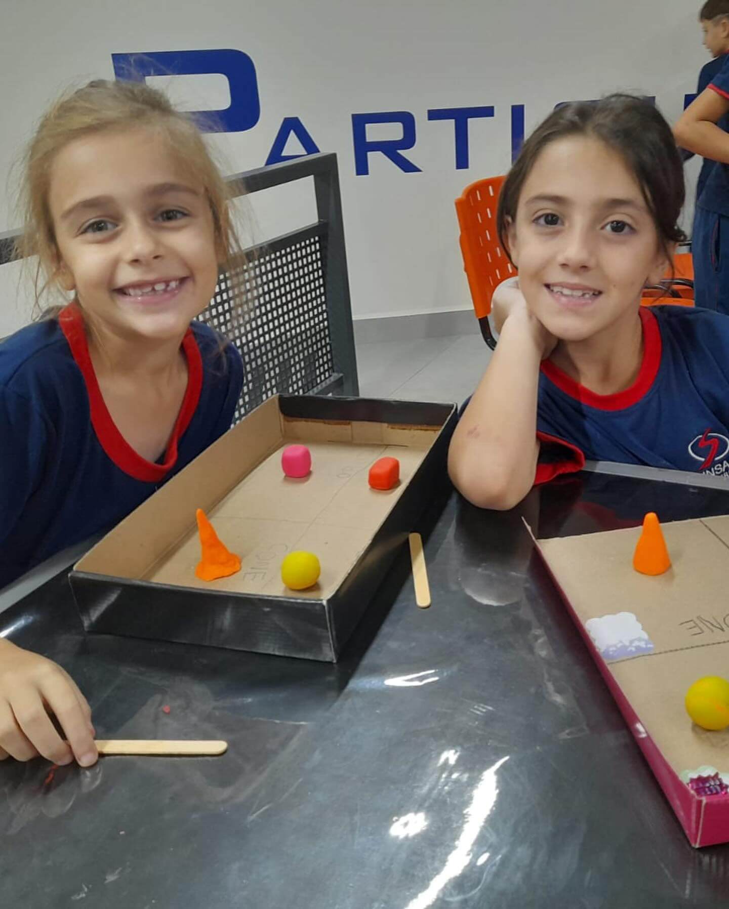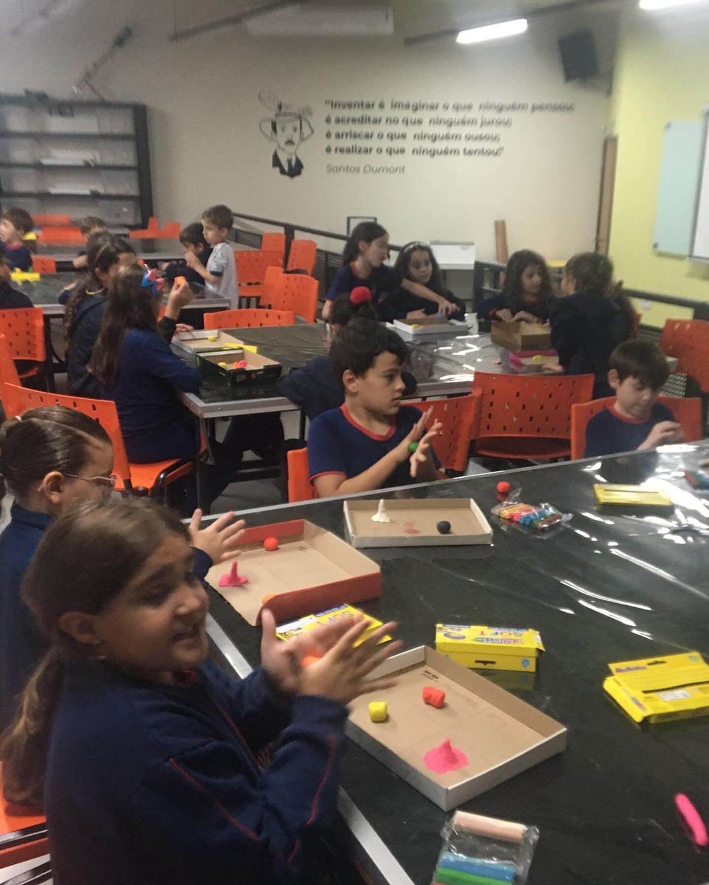 Depois da leitura, os alunos colocaram a mão na massa. Literalmente! Exploraram modelos físicos dos sólidos e, no espaço maker da escola, criaram suas próprias formas com massinha de modelar. Uma forma criativa e concreta de aprender brincando!