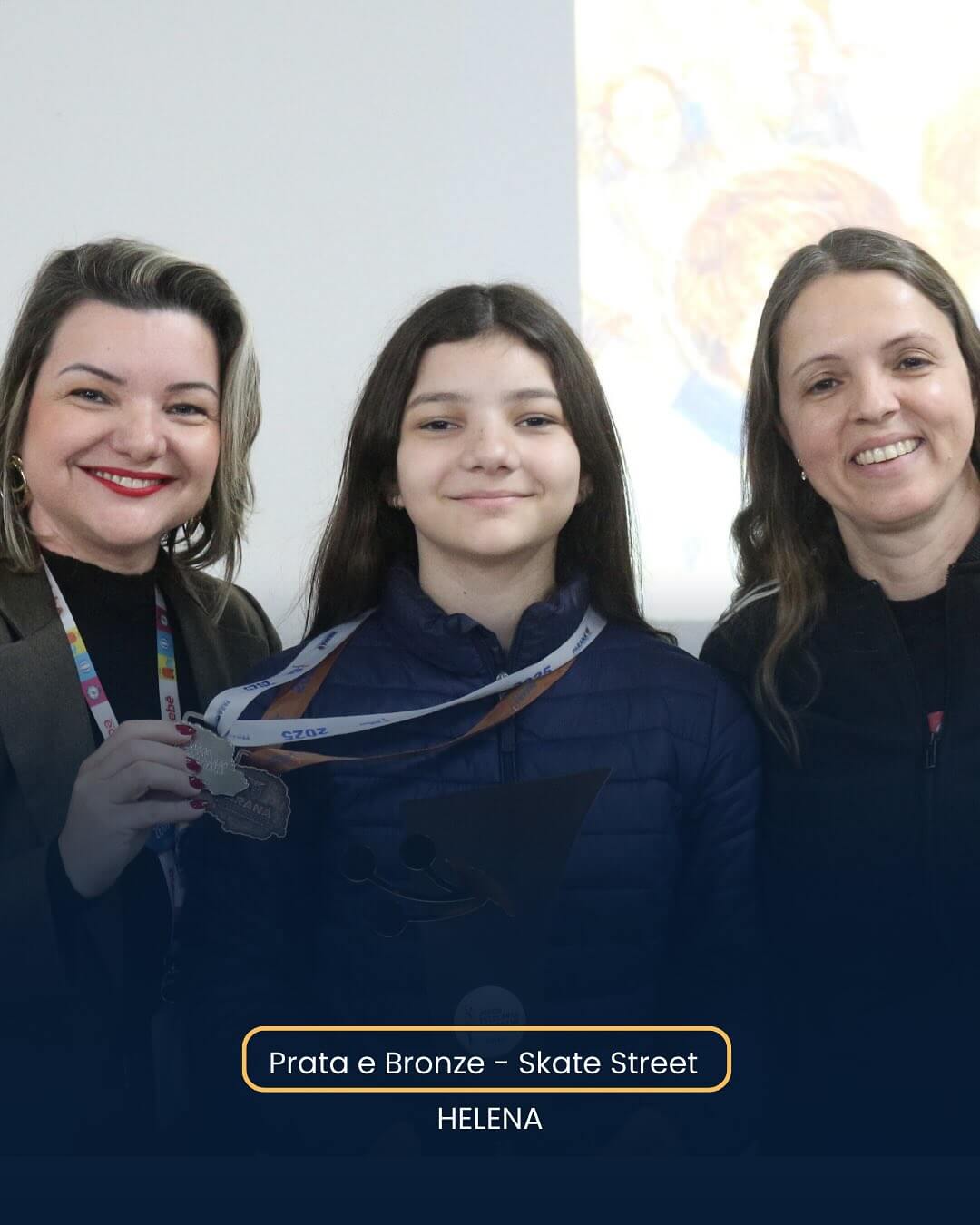 A jovem atleta Helena se destacou nos Jogos Escolares realizados em Toledo-PR, mostrando toda a sua habilidade e talento na modalidade Skate Street. Ela garantiu a medalha de bronze no game e a medalha de prata na linha, resultados que celebram seu esforço e dedicação.