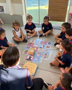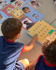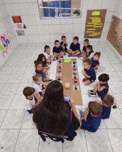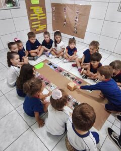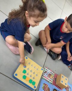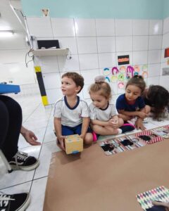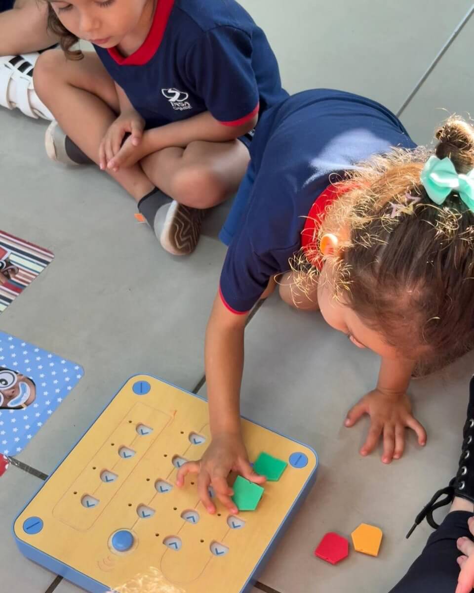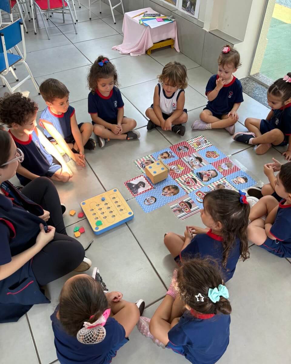 Nesta semana, as crianças do Infantil 3LV participaram de uma experiência cheia de descobertas com o Cubetto, um robô que se movimenta a partir de comandos programados. A atividade foi conduzida pelas professoras Giovana e Isabela, que acompanharam os alunos nesse momento de aprendizado lúdico e significativo. No tapete “Giro da Fama”, construído coletivamente com as fotos da turma, os pequenos exploraram diferentes possibilidades de movimento, transformando a atividade em uma vivência envolvente e personalizada. A proposta despertou curiosidade e incentivou a participação ativa de todos. Ao pensar nos comandos necessários para que o Cubetto chegasse até suas fotos, as crianças sugeriram direções como “para frente” e “para o lado”, acompanhando com entusiasmo cada trajeto do robô. Além de divertida, a experiência contribuiu para o desenvolvimento do raciocínio lógico, da linguagem oral e da compreensão de relações espaciais. A atividade também favoreceu o trabalho em grupo, à medida que os alunos colaboraram para resolver pequenos desafios, fortalecendo habilidades importantes para o processo de aprendizagem desde a Educação Infantil.