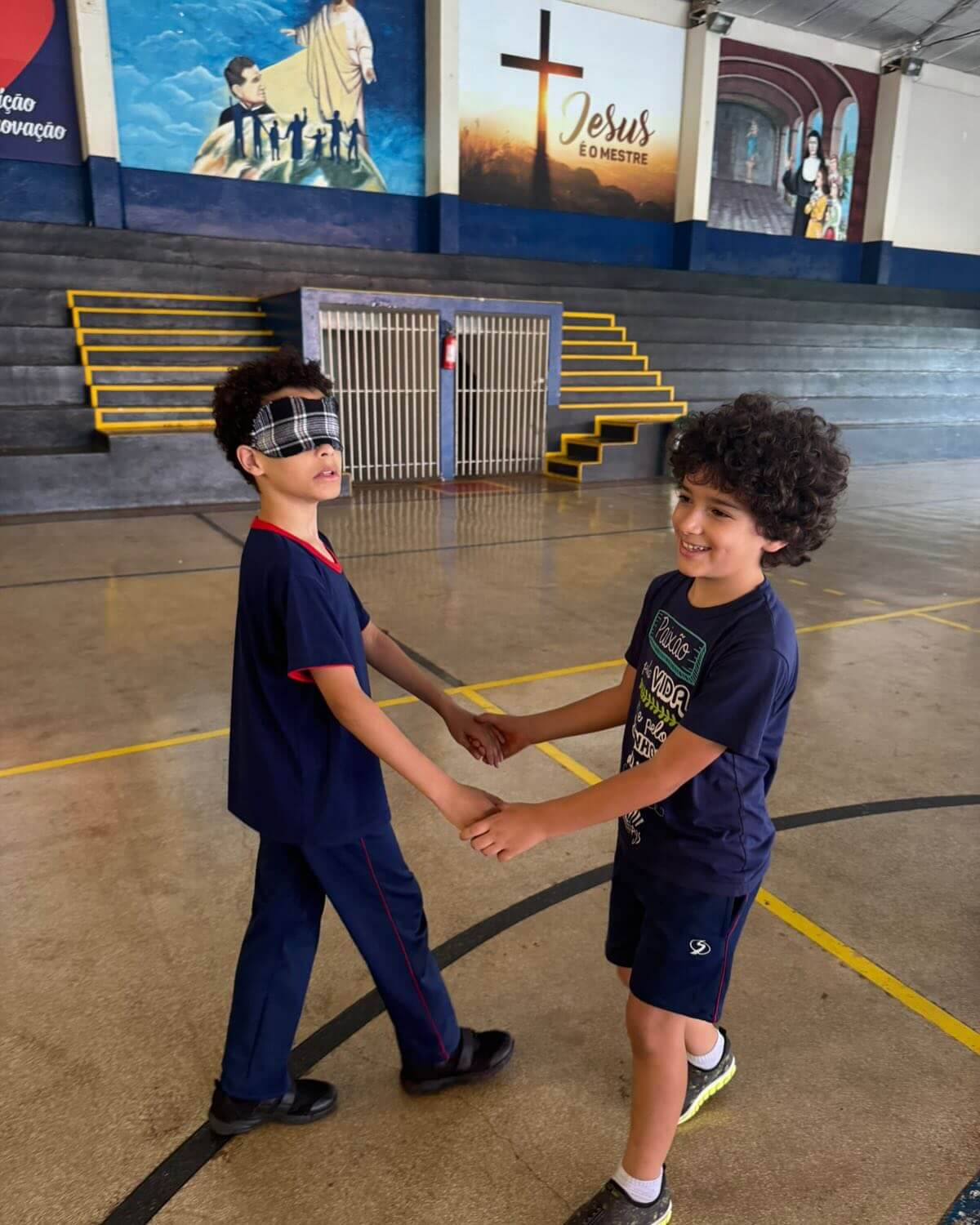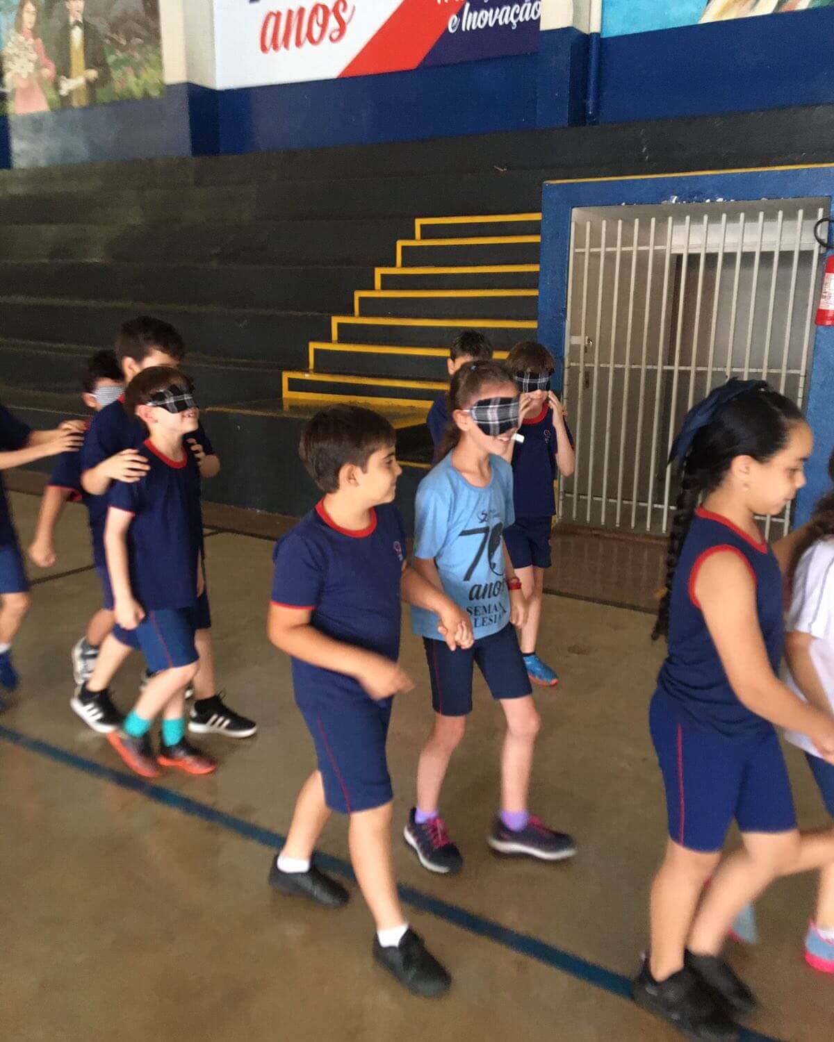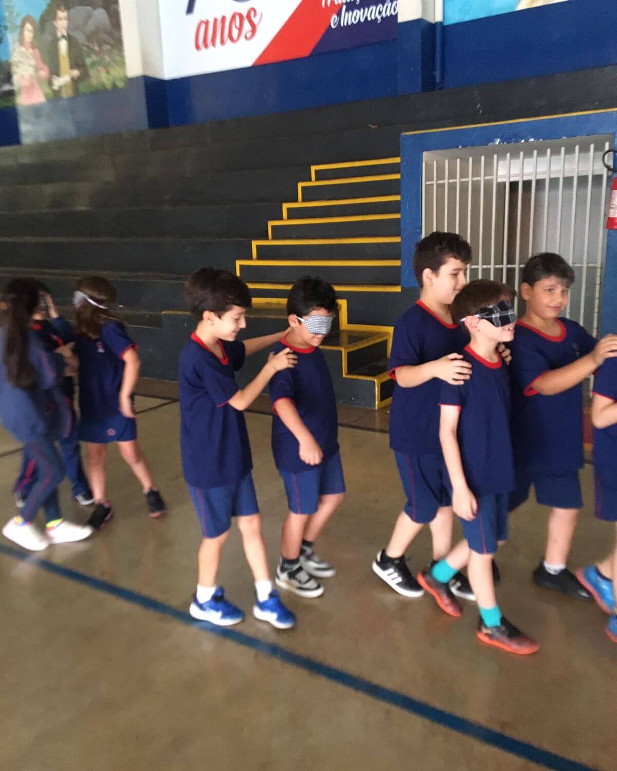 As turmas participaram de uma dinâmica em duplas, onde uma criança teve os olhos vendados e a outra ficou responsável por guiar o colega. A atividade fez todos perceberem que ser luz é iluminar o caminho de quem está ao nosso lado, com amor e respeito.