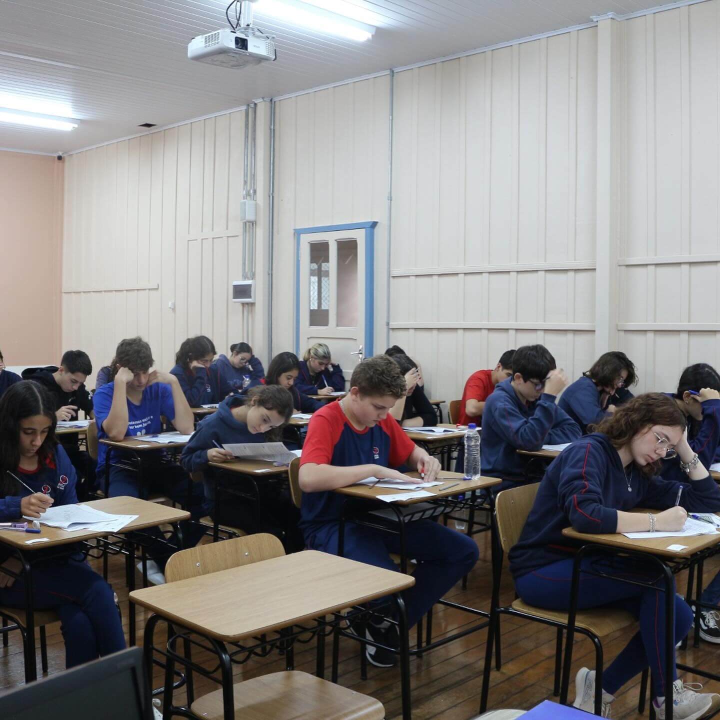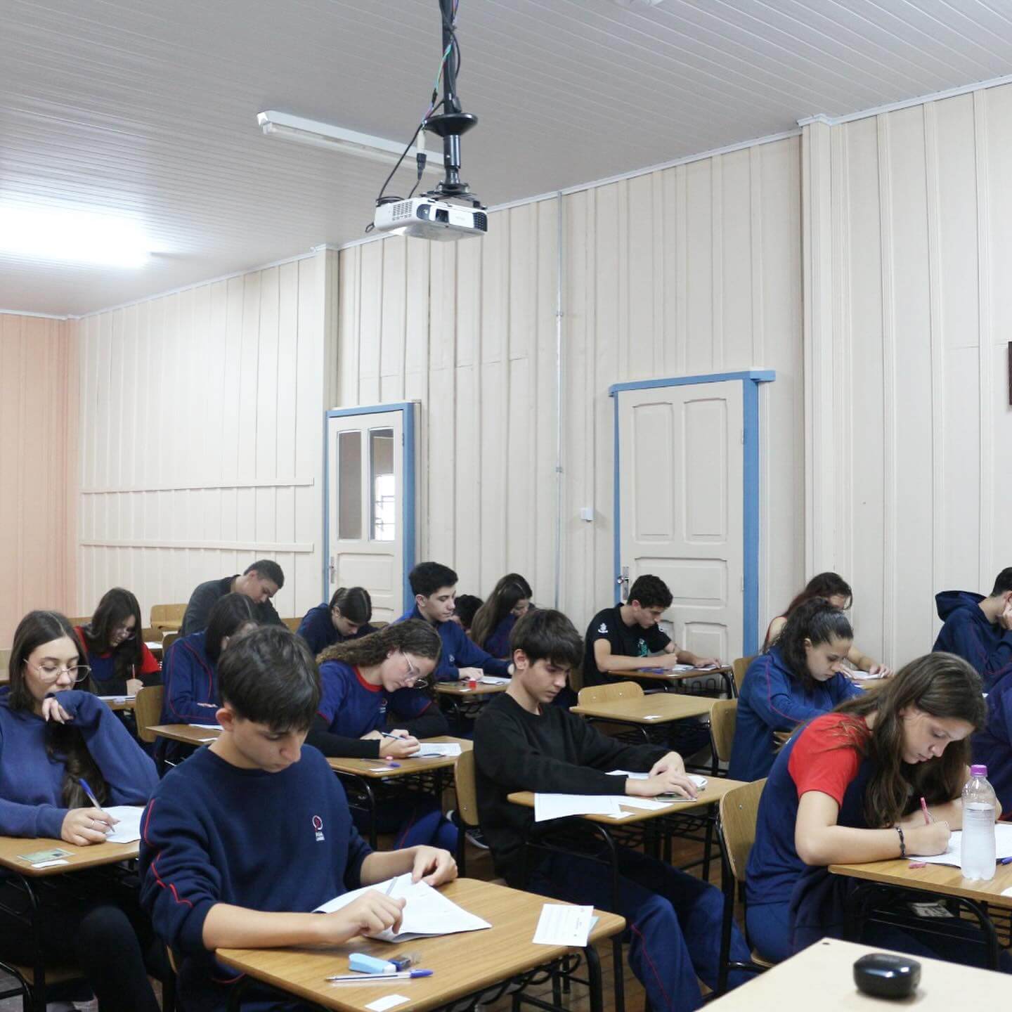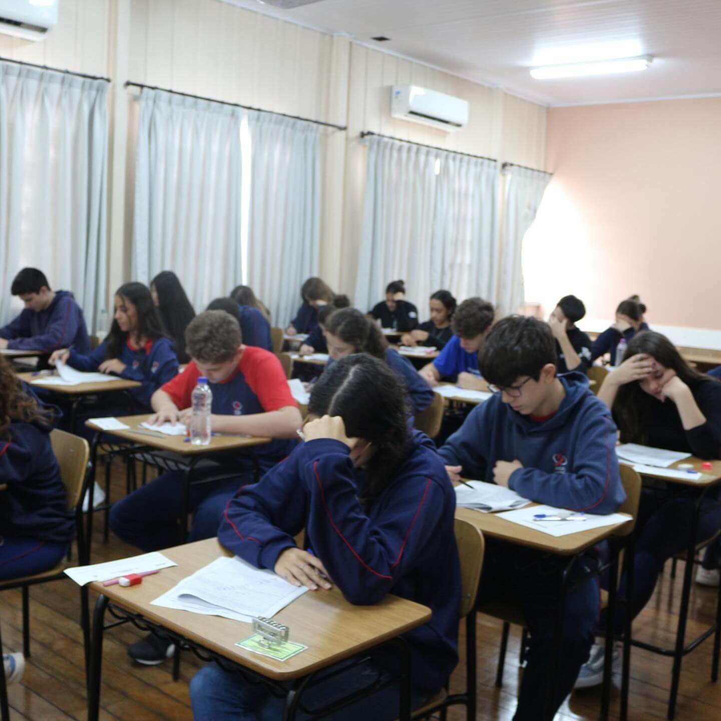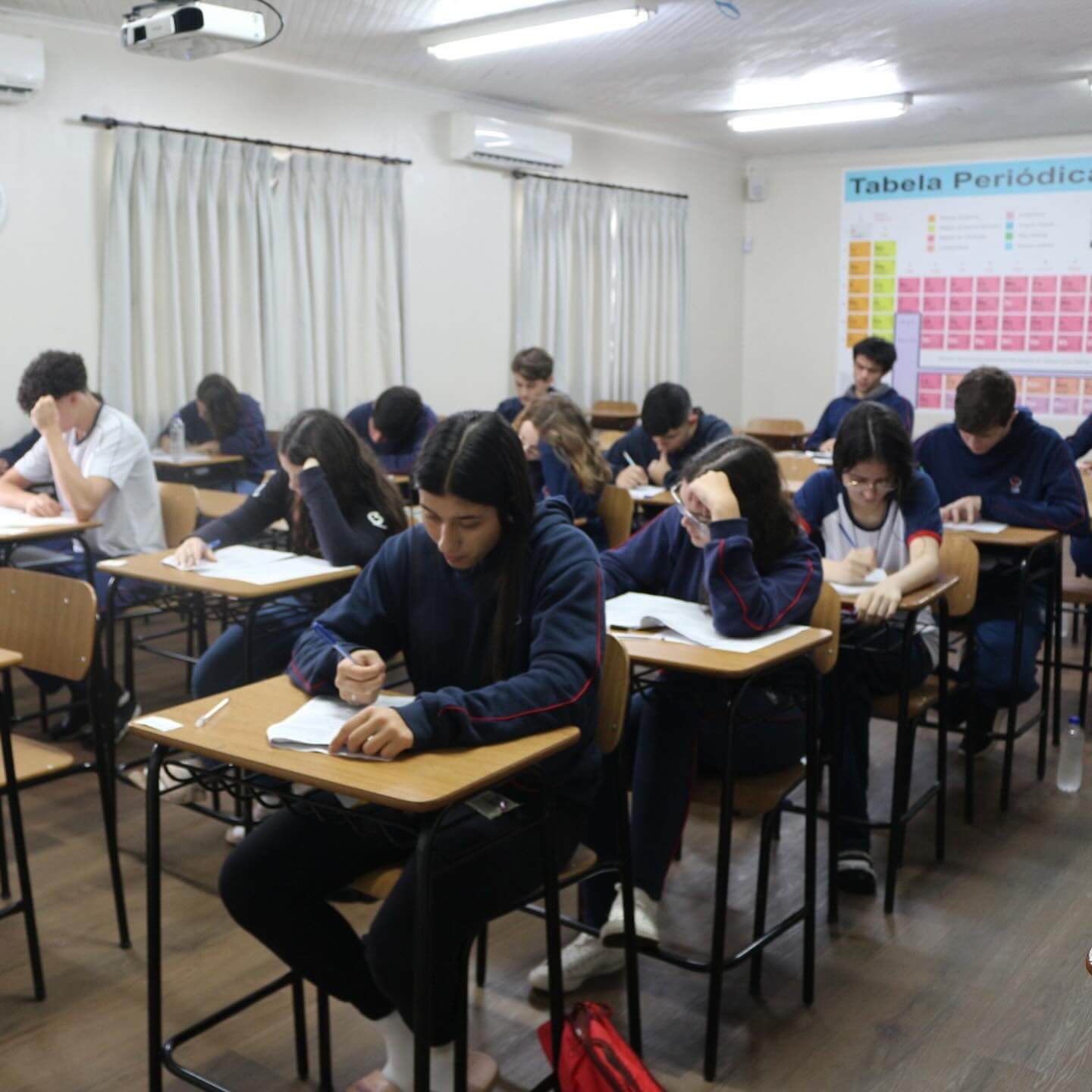 A atividade está sendo realizada na própria escola, em um formato que simula com realismo todas as etapas de um vestibular oficial: lançamento de edital, apresentação de documento de identificação, tempo cronometrado e aplicação em salas específicas.