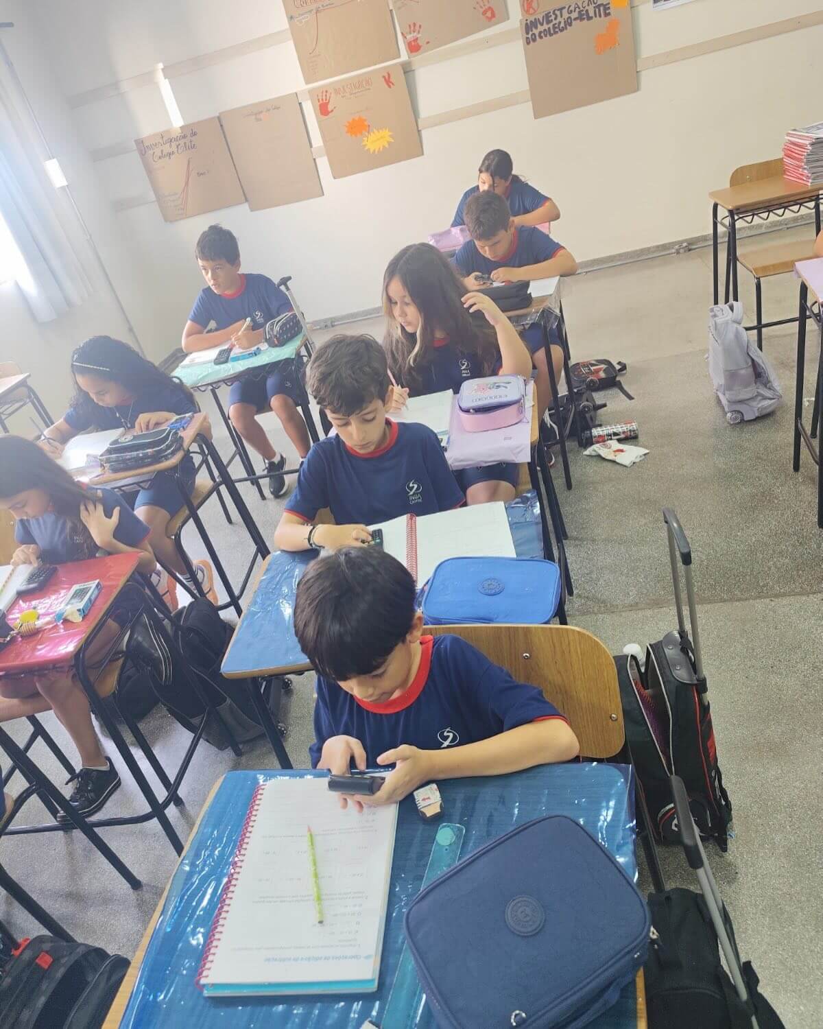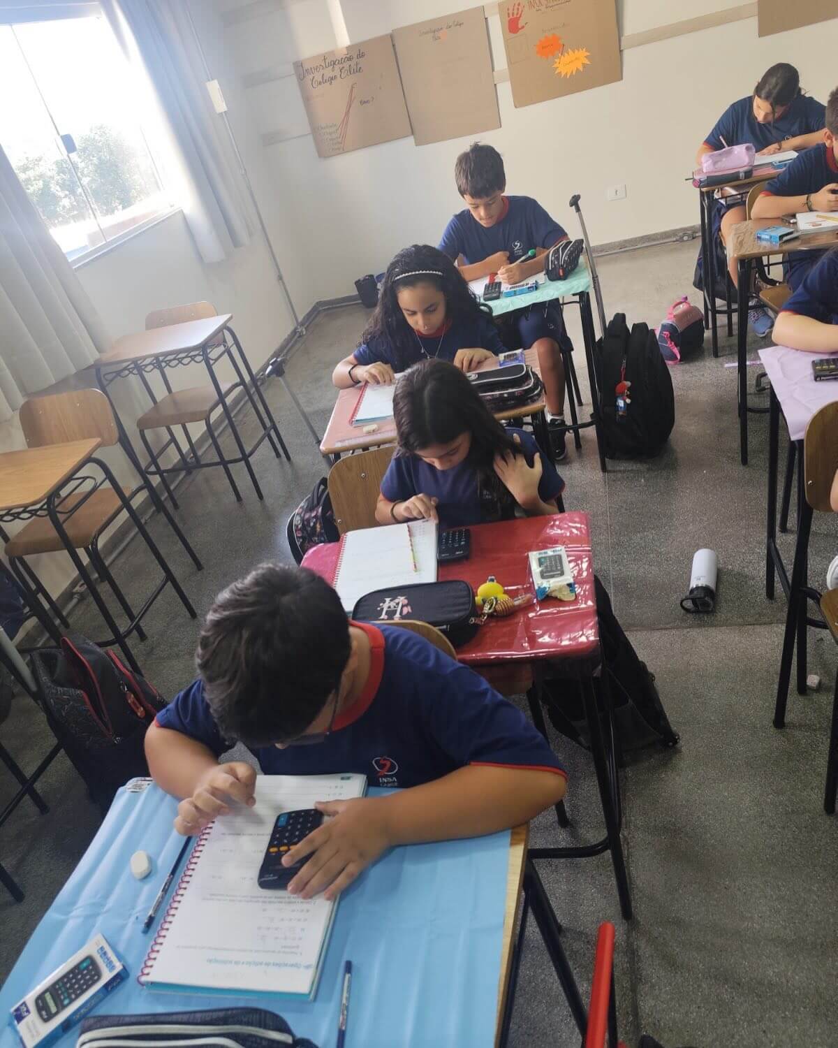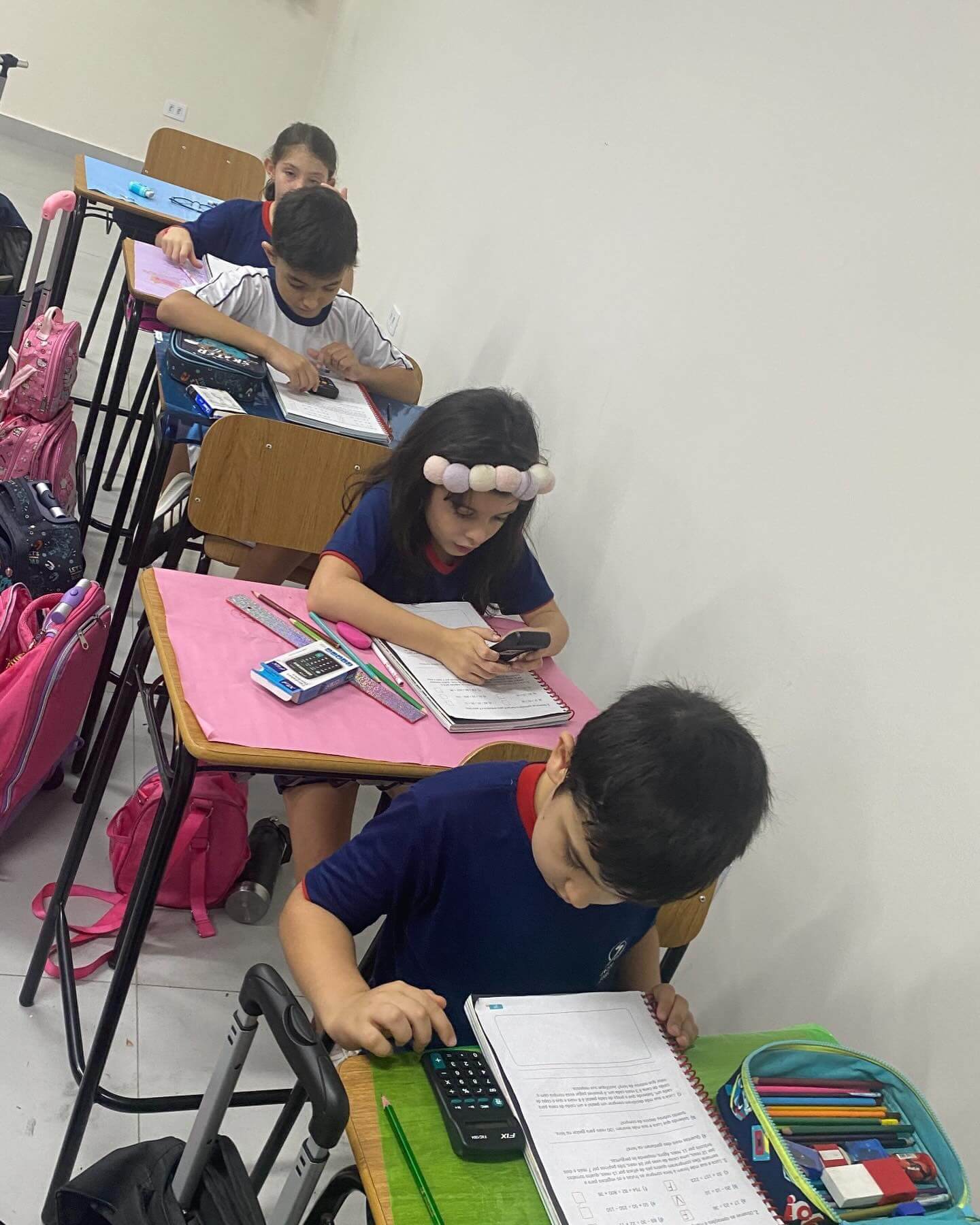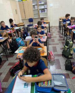 Os alunos do 3º ano C.A., L.V. e M.A., juntamente com as professoras Patrícia, Daniele e Monik, participaram de uma atividade diferenciada durante a aula de Matemática, com foco no uso da calculadora como ferramenta de aprendizagem.
